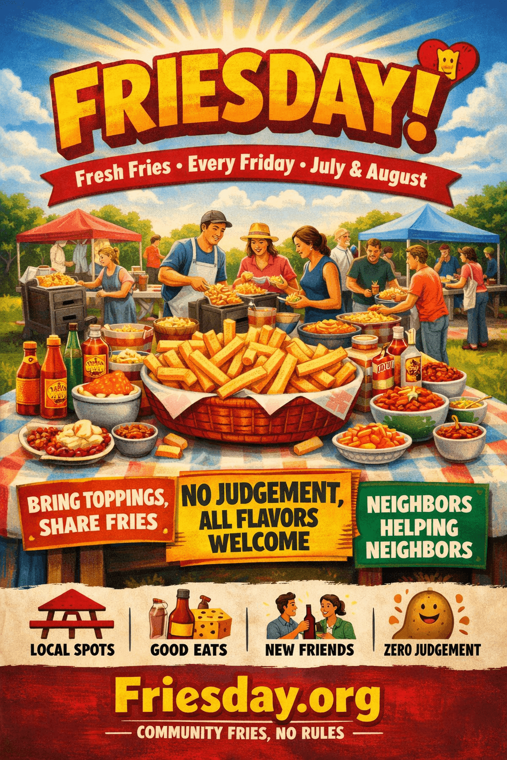 Fresh, home-cooked fries shared freely every Friday during July and August. Not a business. Not a vendor market. Just neighbors cooking and sharing together.